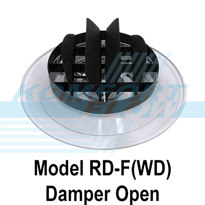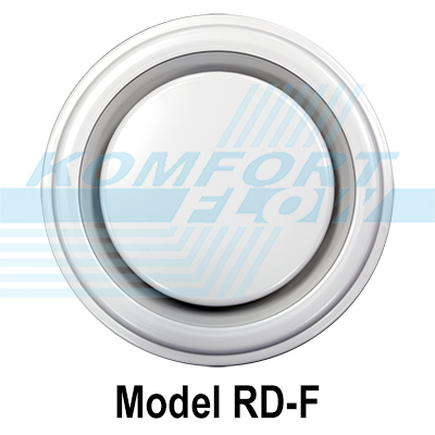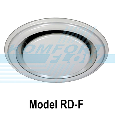 - Model RD-F เป็นหัวจ่ายส่งลมเย็นแบบกลมหน้าเรียบ ติดฝ้าเพดาน สามารถจ่ายลมได้รอบตัว 360 องศา เหมาะสำหรับการออกแบบภายในสมัยใหม่แบบมินิมอล เช่น ห้างสรรพสินค้า โชว์รูม แกลเลอรี่ สตูดิโด ออฟฟิศต่างๆ หรือ การใช้งานกับท่อลมแบบเปิดโล่ง หัวจ่ายรุ่น RD-F ประกอบด้วยขอบโค้งกลมมีแผ่นหน้าเรียบแขวนอยู่ใต้แนวเพดานสามารถปรับขึ้นลงเพื่อเปลี่ยนแบบการกระจายลมได้